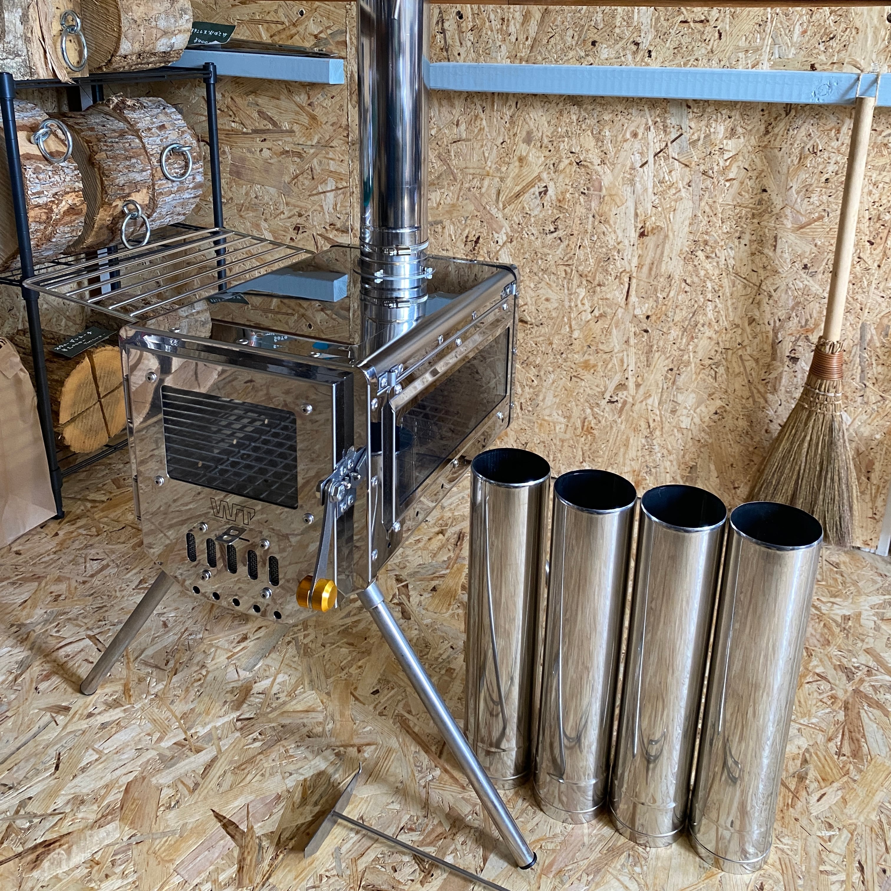 コンパクト性に優れたポータブル薪ストーブです。脚は下りたため、煙突類もすべてストーブ内部に収納可能です。